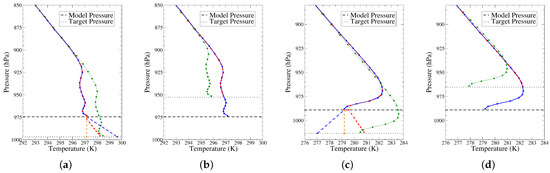To document the differences between the different vertical extrapolation, let us examine the temperature and humidity profiles produced by the different extrapolation methods in two cases, one above Africa and the other above the Alps, when the target elevation is set arbitrary 200 m below (Figure 3a,c) or above (Figure 3b,d) the model topography.