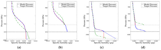 Humidity profiles provided by different extrapolations with last gradient in blue, standard (zero) gradient in red and APACHE method in green. The original profile defined only above the model topography corresponds to the blue points above the model ground pressure. Two examples: the first one over Africa, the second over the Alps. (a,c) with a target below the model topography, (b,d) with a target above the model topography.
