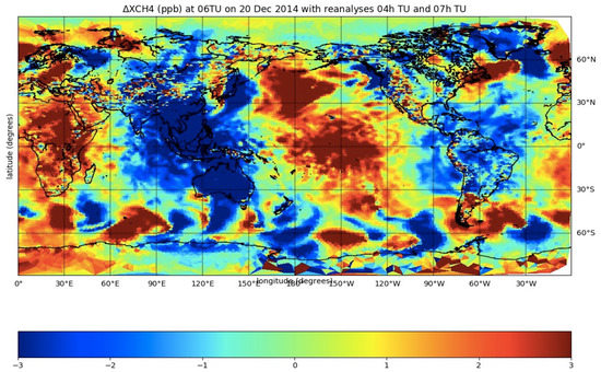 We have decided to use the weather data available every 3 h in the MARS database and to interpolate them linearly. However, it has been highlighted by work carried out by the CNES [20,23] that using model outputs at the hourly frequency leads to systematic differences between the pressure fields predicted at time H and interpolated between H − 2 and H + 1, whether using linear interpolation or a cubic spline. The differences interpreted as being related to the representation of atmospheric tides may induce regional biases up to 3 ppm on the mole fraction of methane with respect to dry air averaged over the atmospheric column (see Figure 5). Indeed, time interpolation creates systematic errors for insufficiently sampled periodic components such as atmospheric tides, as it is well documented in other contexts [24].