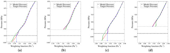 in such a way as to keep the former in the free atmosphere (above the pressure of the top of the upper boundary layer) and to keep the latter close to the target surface (below the pressure of the top of the lower boundary layer), while passing from one to the other in a smooth and regular manner. To achieve this, we set = 175 hPa to define and , and to avoid discontinuities, we ensure that the transition zone is not too small: