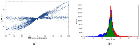 Distribution of the differences between the mole fraction of methane to dry air averaged over the atmospheric column retrieved using the “standard gradient” in LIDSIM and APACHE in PROLID and the same quantity retrieved using APACHE in LIDSIM and the “standard gradient” in PROLID. (a) Each point corresponds to such a difference distributed according to the difference in topography between the meteorological model and the DEM limited for the figure to ±200 m. (b) The histogram of these differences (with a sampling of ppb): in green if the topography difference is between −50 m and 50 m, in red if it is greater than 50 m and in blue if it is less than −50 m. We have eliminated the points with a difference in topography between −10 m and 10 m for reasons of readability, which represents 72,333 points out of 95,360 that are with differences in methane retrieval of less than 0.1 ppb.