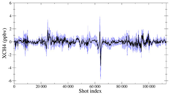 Results for mole fraction of methane to dry air averaged over the atmospheric column for an orbit simulated without instrumental noise. Mean curve in black and area between ± one standard deviation in blue. The shot index corresponds to the position in the simulated orbit which topography as provided in Figure 2a.