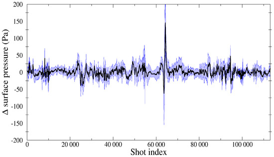 Discrepancies on the surface pressure. Mean curve in black and area between ± one standard deviation in blue.