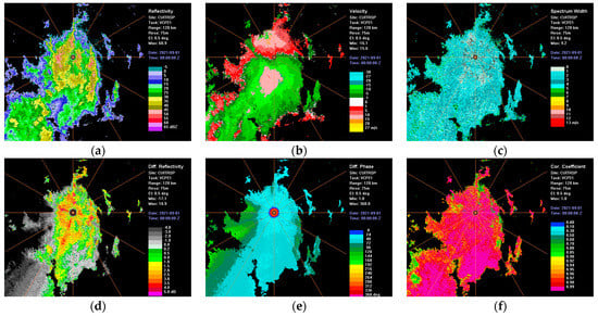The PPI display of reference scene base data. (a) Reflectivity; (b) radial velocity; (c) spectrum width; (d) differential reflectivity; (e) differential phase; (f) correlation coefficient.