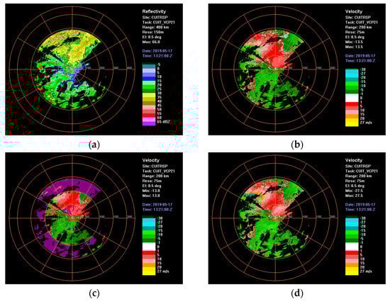 Reference scene base data PPI. (a) reflectivity; (b) velocity; Simulation radar base data PPI. (c) batch mode; (d) SZ(8/64) mode.