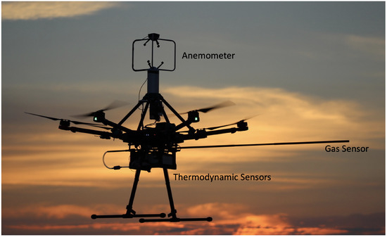 Example of common multi-rotor system operated by the Unmanned Systems Research Institute (USRI, Stillwater, OK, USA) with an instrumentation suite that includes sensors for pressure, humidity, temperature, wind speed, and gas concentration.