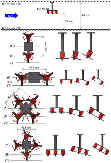 Testing was performed with the water tunnel inlet speed at 0 m/s (hovering condition) or 0.5 m/s. Correcting for the solid blockage effects, the freestream speed increased from 0.5 m/s at the inlet to between 0.52 m/s (dual parallel at 0° tilt angle) and 0.55 m/s (quad-plus at 30° tilt angle) at the model. The rotor diameter based Reynolds number () and advance ratio () had ranges of 39,400 to 42,200 and 0.144 to 0.154, respectively. Here D is the rotor diameter (76.2 mm), U is the freestream speed at the model (corrected for blockage), is the kinematic viscosity ( ms for water), and is the angular rotation speed of the blades. The PIV testing held the angular speed constant at 15 Hz ( rad/s). Note that assuming the model was full scale, the corresponding relative air speed for a nominal viscosity of 1.5 × ms would be between 7.8 and 8.3 m/s, which is within the typical operation range. Similarly, the 900 RPM corresponds to a full scale rotor speed in air of 225 Hz, which is comparable to the upper end of a UAS at full throttle. Thus, the Reynolds number and advance ratio varied by less than 7% over all test conditions examined with PIV and these values are comparable to typical UAS flight conditions.