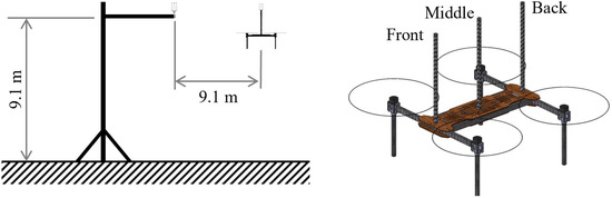 Field testing was performed with a heavy lift quad-copter UAS hovering 9.1 m above the ground and 9.1 m horizontally separated in the cross-wind direction from a fixed mast as illustrated in Figure 3 (left). The wind direction during these tests was coming from the north. Therefore, the UAS was flown to the west and slightly upstream (northward) of the mast’s position. This positioning was done to prevent wake effects from the mast on the drone. The deployable mast (BlueSky Mast, Largo, FL, USA) had an ultrasonic anemometer (ResponseONE 92000, Young, Traverse City, MI, USA) attached that could measure wind speed and direction at speeds up to 70 m/s. The sensor was mounted on a boom that was approximately 1 m long, to offset it from the center of the mast. This anemometer had an uncertainty of m/s for speeds below 30 m/s, which the current study measured speeds below 10 m/s. This sensor is also capable of measuring atmospheric pressure, humidity, and temperature. The quad-copter UAS had a ultrasonic anemometer (Trisonica Mini Wind, Anemoment, Longmont, CO, USA) mounted above the rotors. The UAS anemometer was selected because it was lightweight (50 g) and had a similar resolution to that used on the mast (Model 92000, Young). The UAS anemometer can measure two-components of wind speed up to 50 m/s at a maximum rate of 4 Hz as well as measure temperature and relative humidity. The UAS anemometer could be mounted along the UAS centerline in the front, middle, or back (see Figure 3) at a height (H) above the rotors of 406, 508, or 610 mm. The current study only focused on measurements from the middle position as recommended from the results of the laboratory testing, but Brenner [22] provides results from all positions.