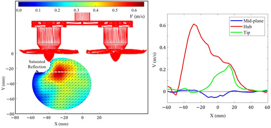 (left) PIV vector field from m/s condition using the quad-X configuration with the laser plane aligned with the hub and the model oriented with 0 deg tilt. The color map corresponds the vertical velocity (V) and the black arrows are the measured vectors. (right) The vertical velocity (V) profile extracted from the condition on the left marked with a thin dashed white line through the vector field as well as the same condition at the mid and tip planes.
