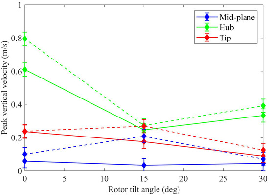 Peak magnitude vertical velocity into the rotor for the Quad-X configuration with the flow at (dashed) 0 m/s or (solid) 0.5 m/s and varying rotor angles at the hub, mid, and tip planes.