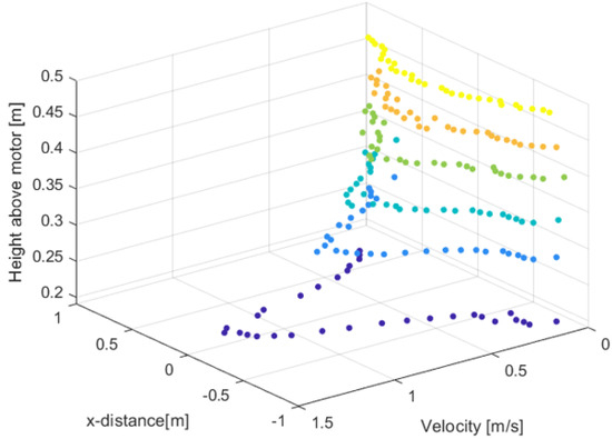Prior to field testing, a single rotor experiment was also performed in an ambient chamber. Here an anemometer was traversed across the rotor at various distances above it (rotor now oriented upward facing like traditional flight). Profiles were acquired at 200, 280, 330, 390, 430, and 480 mm above the rotor. The resulting velocity profiles at each height are shown in Figure 6. Each data point is an average from a 30 s period. Consistent with the PIV study, the highest velocities occur directly above the rotor hub. These results show a significant drop in the induced velocity at approximately 280 m above the rotor. The peak velocity continues to decrease with increasing height, but at a slower rate until the peak has decayed to 0.2 m/s at 480 mm above the rotor. Based on this asymptotic behavior, it was decided that fielding testing should have at least ∼400 mm standoff above the rotor plane. Field testing would then focus on increasing the height beyond 400 mm to assess the trade-off between decreasing rotor influence and decreasing platform stability.