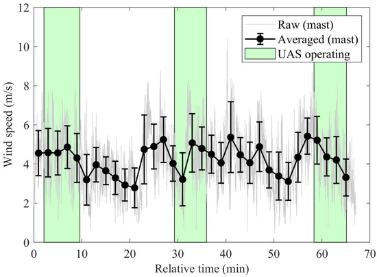 Time trace of wind speed measured on the fixed mast on 10 May 2021. The averaged mast data (thick black curve) is the average from a 2 min non-overlapping window. The error bars are equal to the standard deviation from the given window. Shaded green windows indicate the period of time when UAS data were acquired.