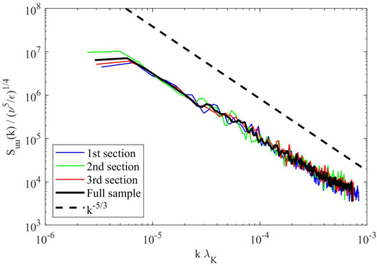 The turbulence spectral density scaled following the K41 theory [28,29,30]. The dashed curve has a slope of for reference.