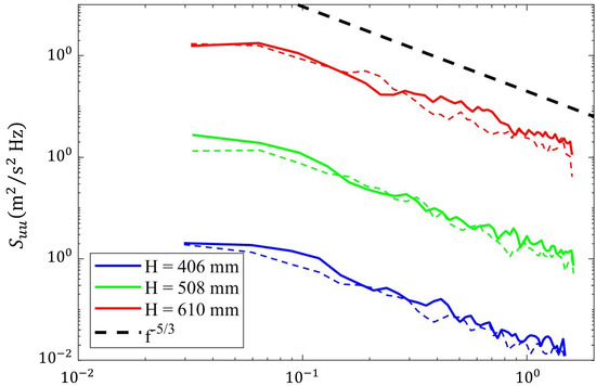 For eddies that are large compared to viscous scales and small compared to production scales (i.e., inertial scales) the energy dissipation rate should be independent of viscosity. This leads to the famous law that states . The dashed line in Figure 8 has a slope, which the current results do not follow this curve having a slope of . While the measurements are at very large Reynolds numbers, the sample rate ( Hz) is relatively low. Consequently, it is informative to investigate where it is expected that these measurements should be in the inertial subrange. Saddoughi and Veeravalli [34] examine the scaling of high Reynolds number turbulent flows and show that even at very high Reynolds numbers the spectra deviate from the curve when . Thus, the current results having a slope below indicates that they are slightly outside of the inertial range, which is consistent with laboratory turbulence results in the literature.