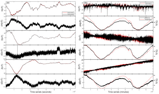 11]. The former has the advantage of being able to obtain absolute time drift parameters for a single instrument, but there is some unavoidable error due to the introduction of the slow changes in the geomagnetic field baseline itself. The latter, which can be interpreted as the relative value of the time drift between the comparative instruments, filters out the error of the slowly changing geomagnetic field baseline during the comparison, but it requires knowledge of one of the instruments’ time drifts in order to give the absolute time drift values of the other.