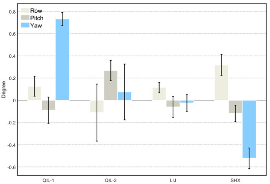 Figure 3, the standard deviation of the statistically calculated values of the attitude angle varies between the different sets of comparative data, and this fluctuation is mainly determined by the quality of the comparative measurements at each observatory. If the standard deviation of an angle calculation result is less than 0.057°, the introduced magnetic field error is less than 1 nT, which is tolerable. However, long-term comparative observations are often subject to a variety of disturbances and instrument restarts, which introduce data step problems. Therefore, an angular standard deviation of 0.057° is not always guaranteed. When the standard deviation of the angle is slightly greater than this limit and its mean value is neither negligible nor zero, we still consider there to be a relative attitude angle in that direction. Finally, we identified an attitude angle when the standard deviation is less than half the mean in a set of certain comparative data. In contrast, for cases where the standard deviation is significantly greater than the calculated mean, which means that the length of the error bar covers even its histogram, no significant relative attitude angle is considered to exist in that direction and a value of zero is taken.