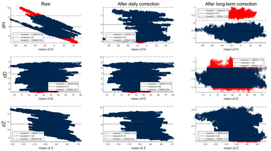 Qualitatively, the diagonal distribution presented by the raw data in the B–A plot disappears after the daily correction, which is a typical effect of the attitude angle and the scale factor correction. Quantitatively, the 95% confidence intervals for the B–A plots decreased from 3.54/8.29 nT, 3.52/9.89 nT, and 6.96/15.83 nT to −1.29/0.15 nT, −1.61/−1.16 nT, and −1.41/0.66 nT, respectively, before and after correction. The length of the interval is significantly reduced, and the mean value of the difference is closer to zero, which is more in line with the B–A plot model of random error.
