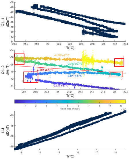 Figure 5 shows scatter plots of the temperature versus the difference in the Z component of QIL-1, the H component of QIL-2, and the D component of LIJ. The H component of QIL-2 with the most pronounced trend was selected for specific analysis. In the middle panel of