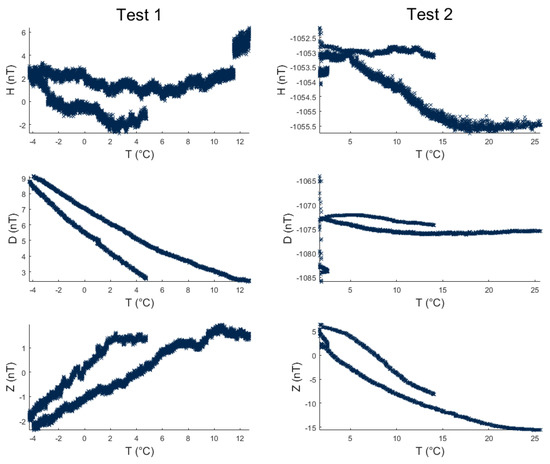 Figure 6 shows the scatter plots of the instrument temperature versus measured values for both tests. It can be seen that the laboratory tests also show a similar V-shaped distribution to the long-term comparative measurements, suggesting that the temperature coefficient of the separate magnetometer changes during the warming and cooling process.