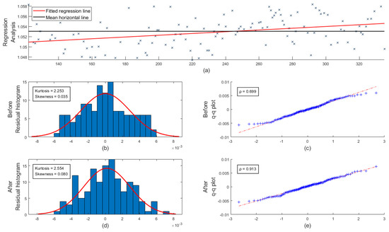 Figure 7a shows a scatter plot of the scale factor over time, in which the black line represents the mean value of the dataset and the red line represents the linear regression fitted line.