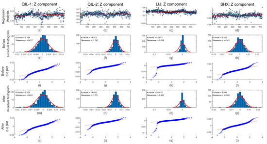 Figure 7b. The kurtosis of the linear regression’s residual distribution is closer to the kurtosis value of the normal distribution, which is equal to three, the linearity of the data points in the corresponding q–q plots is greater, and the probability of similarity will be higher between experimental and normal theoretical distributions is much higher (from 0.699 to 0.913), all of which indicate that the linear regression of the time drift has a positive correction effect to some extent. However, after examining the long-term time drift of four sets of two-year-long comparative measurements, we concluded that the long-term time drift of the same probe fluxgate variometers that meet the operational requirements of the Geomagnetic Network of China is so small that it can be neglected without correction.