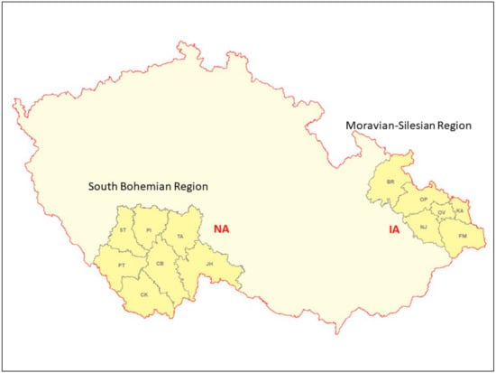 The South Bohemia region, located in the southern part of the country, was chosen as a non-industrial area (NA non-industrial area). The South Bohemian Region is defined by the districts of České Budějovice (CB), Český Krumlov (CK), Jindřichův Hradec (JH), Písek (PI), Prachatice (PR), Strakonice (ST), and Tábor (TA) (see Figure 1). CB is the capital of the NA region. For a long time, it has been an agricultural area with developed fish farming and forestry. Only in the last century has the industry developed with a focus on manufacturing activities. Industrial production is concentrated mainly in the CB agglomeration. Compared to the IA region, this region is not a resource-rich area and contains almost no sources of raw energy materials. Therefore, the environment is characterized as less damaged and polluted [8]. The sources of pollution are mainly agriculture, but also industry, local heating, and automobile transport are contributing factors.
