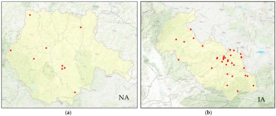 Air quality monitoring was first processed. Air quality monitoring data for both compared areas have been available in the database since 1997 (in the case of the OV district since 1972). The air quality monitoring station network meets the quality system requirements of the international standard EN ISO/IEC 17025:2017. In IA, compared to NA, the air quality monitoring network is significantly denser and the databases contain more monitored pollutants. Since 1997, there have been numerous changes in the location of air quality monitoring stations and their measurement programs. Figure 2 shows the location of air quality monitoring stations within the study areas as of 2019.