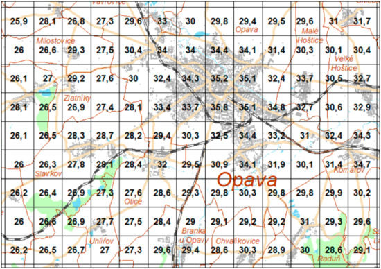 - Compared to the proposed approach, the LUR method requires a larger number of monitoring stations with a sufficiently variable number of characteristic types of monitored zones. In our case, we use a specific long-term average regular network of the air pollution characteristics database for estimation, which serves as a spatially very detailed basis for identification modelling from available air quality monitoring data.