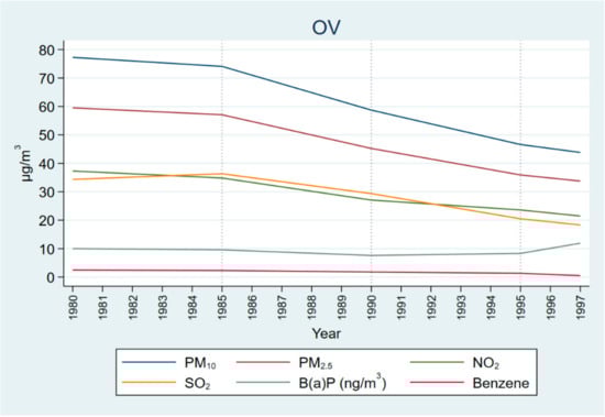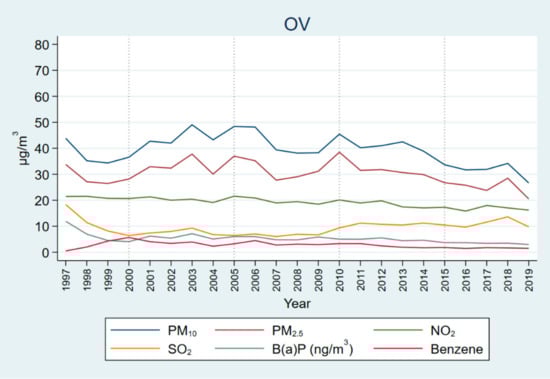 Trends in air pollutant concentration for the OV district for the years 1997–2019.