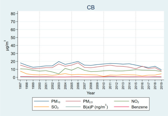 Trends in air pollutant concentration for the CB district for the years 1997–2019.