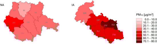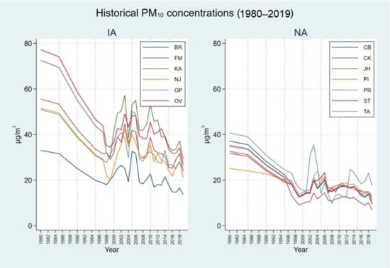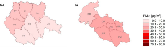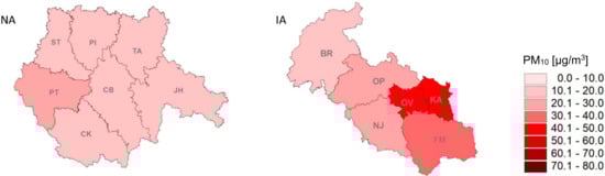 The resulting annual concentration data for each year under consideration consist of a total of 78 values (six pollutants for the 13 districts assessed). For the period 1997–2019, the total number of years was 23. For the period 1980 to 1997, the total number of estimated years was four (five-year intervals 1980, 1985, 1990, and 1995). Due to the large size of the resulting dataset, the results are presented in this study as an example in the form of comparison maps between IA and NA for PM10 and only for the years 1980, 1997, and 2019 (Figure 7, Figure 8 and Figure 9). Figure 10 shows graphically the resulting time series of annual average PM10 concentrations of each district of the compared areas for the period 1980–2019. In this case, the determination of the estimated concentrations for all districts was based on the needs of the HAIE project, for which the concentrations were estimated. The entire procedure is focused on epidemiological studies, where population health data are related to the smallest territorial unit of the district.