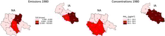 Significant differences for 1980 are due to greater uncertainty in the estimation of concentrations. In 2019, the differences in IA are due to a greater share of concentrations in the industrial agglomeration of the border with Poland [14,15].
