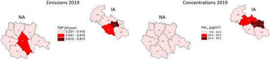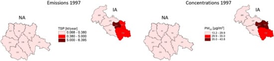 Trends in emissions and concentrations over time and space were compared. Figure 11, Figure 12 and Figure 13 show a decreasing trend in emission burden, and globally, the concentration estimates are in agreement with the emission balance of the compared areas and individual districts.