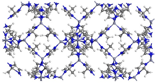 The preparation of ZIF8 was referred to the method reported by Cho [17]. Then, 5.9498 g of Zn (NO3)2·6H2O and 6.5683 g of MIM were dissolved in 200 mL of methanol, respectively. The methanol solution of MIM was then added into the methanol of Zn (NO3)2·6H2O, and the mixture was placed in an ultrasound for 4 h at the temperature of 22~25 °C. The white precipitate of ZIF8 was obtained after the mixture incubated for 24 h. ZIF8 was then centrifuged and washed three times with methanol. The activation of ZIF8 was in a vacuum drying oven at 80 °C for 6 h. A unit of ZIF8 is composed of four coordination bonds formed between Zn in ZIF8 and N in MIM [42], shown as Figure 1.