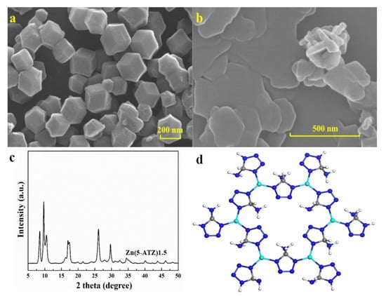 Figure 3a and b gives the SEM patterns of ZIF8 and Zn(5-ATZ)1.5, respectively. After modification, the nanoparticle of ZIF8 with octahedron morphology structure turned into a two-dimensional nano-layered structure, which was in line with the work conducted by Zhang [44]. The XRD patter of Zn(5-ATZ)1.5 as shown in Figure 3c, which was quite different with that of ZIF8 (see Figure S1 in the Supplementary Materials) due to the change of the structure. The observed diffraction peaks were consistent with that of the sample synthesized by direct synthesis [44]. This clearly suggested that Zn(5-ATZ)1.5 could also be prepared by PSM, which was proved to greatly reduce the preparation time and had a higher yield compared with the reported methods [44]. The structural diagram of Zn(5-ATZ)1.5 was exhibited in Figure 3d. Compared with ZIF8, three coordination bonds are formed between Zn in Zn(5-ATZ)1.5 and N in 5-ATZ, which led to its structure into two-dimensional and nano-layered, instead of octahedron morphology.