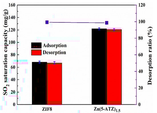 The SO2 adsorption activity of Zn(5-ATZ)1.5 and ZIF8 is shown in Figure 4. It can be seen that under the same conditions, the SO2 saturation capacity of Zn(5-ATZ)1.5 is 122 mg/g, which is about 1.8 times higher than that of ZIF8 (68.8 mg/g). Considering the fact that the specific surface area of ZIF8 decreased significantly after modified while its saturation capacity on SO2 increased notably, it can be concluded that the introduction of amino group greatly promoted the adsorption of SO2. In addition, from the SO2 desorption ratio of Zn(5-ATZ)1.5, SO2 is considered to be desorbed completely, indicating that the adsorbent has good regeneration performance. The SO2 adsorption capacities of some adsorbents mentioned previously were summarized in Table 2. Obviously, the saturation capacity of Zn(5-ATZ)1.5 was higher than those of HKUST-1, KAUST-7, KAUST-8, FMOF-2, and ZnCo, some of which were even adsorbed in pure SO2 atmosphere.
