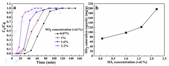 The effect of SO2 concentration on the removal of SO2 by Zn(5-ATZ)1.5 ((a)—breakthrough curve; (b)—saturation capacity; adsorption temperature: 25 °C, desorption temperature: 120 °C, volume airspeed: 2865 h−1).