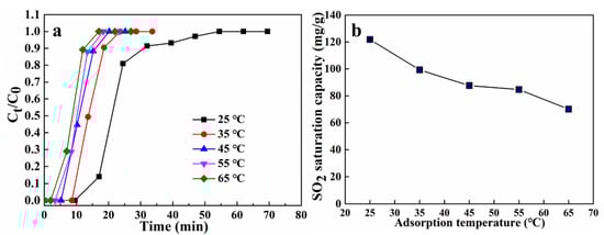 The effect of temperature on the removal of SO2 by Zn(5-ATZ)1.5 (a)—breakthrough curve; (b)—saturation capacity; adsorption temperature: 25 °C, desorption temperature: 120 °C, gas composition (vol %): 1.6% SO2 and 98.4% N2, volume airspeed: 2865 h−1.