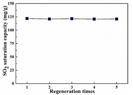 For any potential applications, the regeneration performance of adsorbents determines whether they can be recycled. Five continues adsorption–desorption experiments of Zn(5-ATZ)1.5 on SO2 removal were shown in Figure 7. The SO2 saturation capacity of Zn(5-ATZ)1.5 remains at about 122 mg/g without obvious decline. Obviously, the adsorbent of Zn(5-ATZ)1.5 possesses an excellent regeneration performance, which is beneficial for its potential application. Besides, the excellent regeneration performance also implied the interaction between the Zn(5-ATZ)1.5 and SO2 is completely reversible under the given experiment conditions.