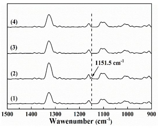 In order to explore the interaction mechanism between Zn(5-ATZ)1.5 and SO2, the Raman spectra of the fresh Zn(5-ATZ)1.5 (1), Zn(5-ATZ)1.5 after saturated with SO2 (2), Zn(5-ATZ)1.5 after SO2 desorption (3) and Zn(5-ATZ)1.5 after five continuous adsorption–desorption cycles (4) were characterized, respectively, as shown in Figure 8. Obviously, a new band appeared at 1151.5 cm−1 after SO2 adsorption, which belongs to gaseous SO2 [48,49]. This indicates that there is physical adsorption between SO2 and Zn(5-ATZ)1.5. The band (at 1151.5 cm−1) of Zn(5-ATZ)1.5 after SO2 desorption (3) and five continuous adsorption–desorption cycles (4) disappeared, which also shows that the SO2 adsorbed by Zn(5-ATZ)1.5 can be completely desorbed. This result is consistent with the good regeneration performance mentioned above.