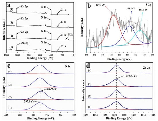 The XPS spectra of the Zn(5-ATZ)1.5 before and after SO2 adsorption ((a)—survey spectra; (b)—S 2p; (c)—N 1s; (d)—Zn 2p; 1—fresh Zn(5-ATZ)1.5; 2—Zn(5-ATZ)1.5 after saturation with SO2; 3—Zn(5-ATZ)1.5 after SO2 desorption; 4—Zn(5-ATZ)1.5 after five continuous adsorption–desorption cycles).