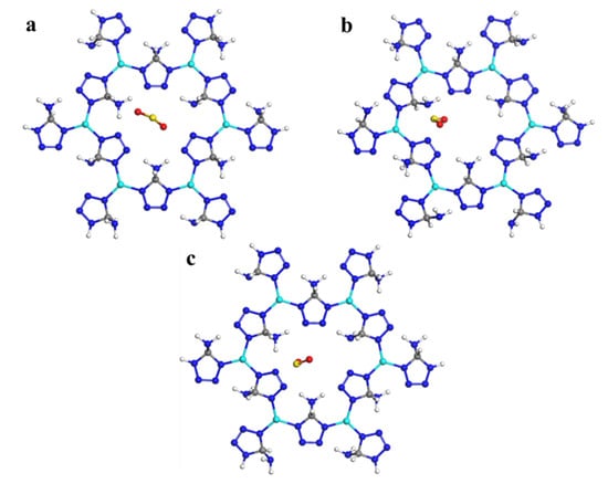 In this study, three possible adsorption sites of Zn(5-ATZ)1.5 were attempted to adsorb SO2. As shown in Figure 10, the three possible interactions include: SO2 with the H of -NH2 in Zn (5-ATZ)1.5 by hydrogen bond (Figure 10a), SO2 with the N of -NH2 in Zn(5-ATZ)1.5 by non-covalent charge transfer complexes (Figure 10b), and SO2 with the N of the 5-aminotetrazole ring in Zn(5-ATZ)1.5 by non-covalent charge transfer complexes (Figure 10c). Considering that the interaction between SO2 and coordination unsaturated metals in MOFs is unreversible [53], and the fact that the regeneration performance of Zn(5-ATZ)1.5 was excellent, the calculation of adsorption energy of the interaction between SO2 with Zn in Zn(5-ATZ)1.5 can be excluded.