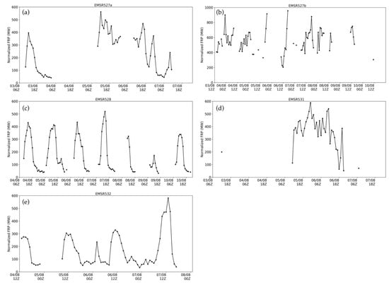 Time series of hourly normalized FRP from SEVIRI/METEOSAT: (a) EMSR527a, (b) EMSR527b, (c) EMSR528, (d) EMSR531, and (e) EMSR532. Note the differences in the vertical and horizontal axes’ scales.