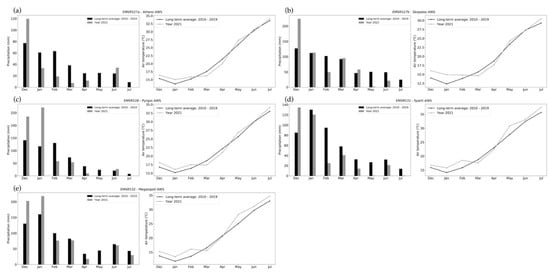 Mean monthly values of precipitation (bars) and daily maximum air temperature (lines) for the period December–July: (a) Athens AWS-EMSR527a, (b) Skopelos AWS-EMSR527b, (c) Pyrgos AWS-EMSR528, (d) Sparti AWS-EMSR531, and (e) Megalopoli AWS-EMSR532. Black bars (lines) denote the climatological means computed based on the record span of each AWS (Table 2). Grey bars (lines) denote the 2020/2021 recorded values.