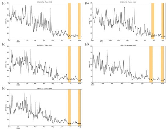 Time series of the daily DFMC for the period December–August: (a) Tatoi AWS-EMSR527a, (b) Vateri AWS-EMSR527b, (c) Oleni AWS-EMSR528, (d) Krokees AWS-EMSR531, and (e) Arfara AWS-EMSR532. The yellow-shaded areas delineate heatwave periods.