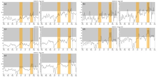 Figure 3 shows the time series of the December–July monthly accumulated precipitation and monthly mean of daily maximum air temperature compared against the corresponding long-term means (Table 2). Except for December and January, which proved to be wetter than average in most AWSs, the recorded late winter (February) and springtime precipitation were in general below normal. Precipitation deficits were found to be maximum in February, ranging from −72.1 mm (EMSR528; Figure 3c) to −23.4 mm (EMSR532; Figure 3d). Focusing on the fire season months (May–July), it is worth noticing that May and July were marked by the absence of any significant precipitation in almost all fire-affected regions, while June was locally wetter than average due to convective activity that took place during the first half of the month. In terms of temperatures, the fire-affected regions were characterized by warmer than average conditions throughout the December–July period, except for March and April, which showed negative temperature departures. Altogether, the warm and dry conditions that prevailed during the months preceding August 2021 should have contributed to preconditioning fuels by promoting drying, thereby supporting wildfire activity.