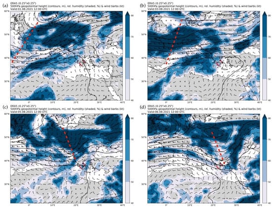 ERA5 500 hPa geopotential height (contours) and wind (barbs), and 650–450 hPa maximum relative humidity at 12:00 UTC on (a) 1 August, (b) 3 August, (c) 5 August, and (d) 6 August 2021. The red dashed lines denote the axis of the upper-level trough. The red dots denote the ignition locations of the examined wildfires.