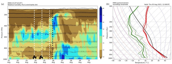 The breakdown of the ridge ahead of the arriving upper-level trough contributed to escalating the potential for extreme fire behavior and the development of pyroconvection by increasing atmospheric instability. This can be seen in Figure 7a, which clearly shows the advection of mid-level (650–450 hPa) moist air (relative humidity exceeding 40%) above the considerably dry (relative humidity lower than 20%) lower troposphere (1000–800 hPa) of the fire-affected regions. As a result, the vertical structure of the atmosphere on 5 August, when intense pyroconvection was observed in all wildfires, shows a characteristic “inverted V” profile with elevated instability (Figure 7b). This points to a thermodynamic environment conducive to the onset of pyroCus/Cbs, as also noted in previous studies e.g., refs. [5,19].