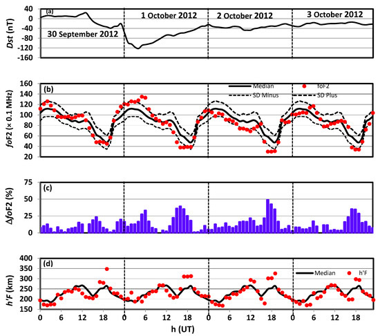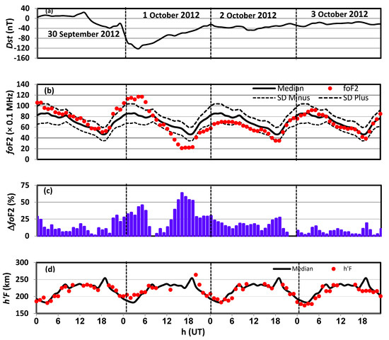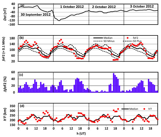 Variations of (a) Dst index for the geomagnetic storm, (b) hourly values of critical frequency of F2 layer (foF2) (MHz × 10−1), (c) ∆foF2%, and (d) virtual height of F layer (h′F) during 30 September–3 October 2012 at Townsville station. The median values of foF2 and h′F parameters are shown by solid black curves in panels (b,d). Dashed curves in panel (b) show the variation of foF2 by ± 1 σ.