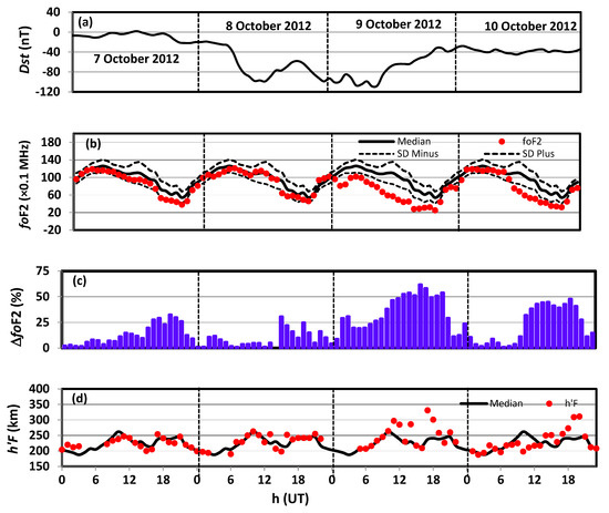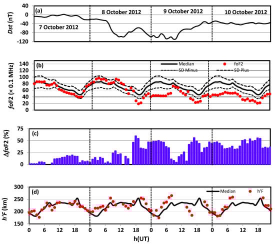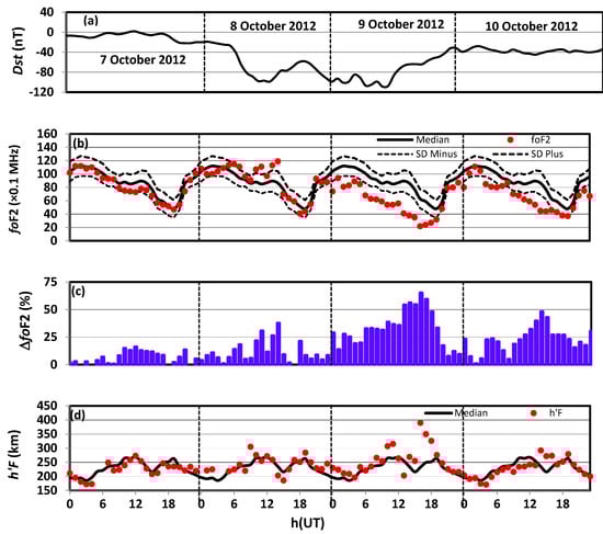 Variations of (a) Dst index for the geomagnetic storm, (b) hourly values of critical frequency of F2 layer (foF2) (MHz × 10−1), (c) ∆foF2%, and (d) virtual height of F layer (h′F) during 7–10 October 2012 at Townsville station. The median values of foF2 and h′F parameters are shown by solid black curves in panels (b,d). Dashed curves in panel (b) show the variation of foF2 by ± 1 σ.